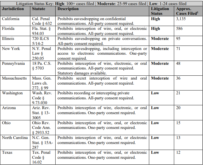As the chart illustrates, litigation activity remains concentrated in a handful of jurisdictions, particularly those that require all-party consent. However, plaintiffs’ firms are rapidly expanding these theories beyond their original strongholds, signaling that the current geographic concentration is unlikely to remain static. Businesses should evaluate their practices from a nationwide perspective rather than focusing solely on historically active jurisdictions.