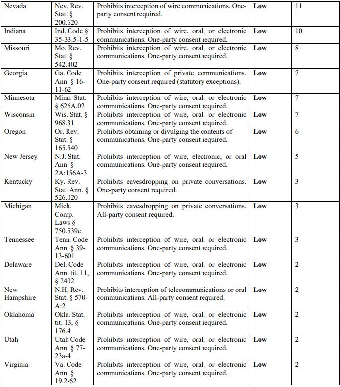 The federal Wiretap Act establishes a baseline prohibition against the unauthorized interception of electronic communications, while state statutes impose additional, sometimes more stringent, requirements. Together, these laws create a complex and evolving liability landscape for businesses that rely on tracking technologies. The chart below summarizes key state wiretapping laws, including the applicable statute, core requirements, and current levels of litigation activity.