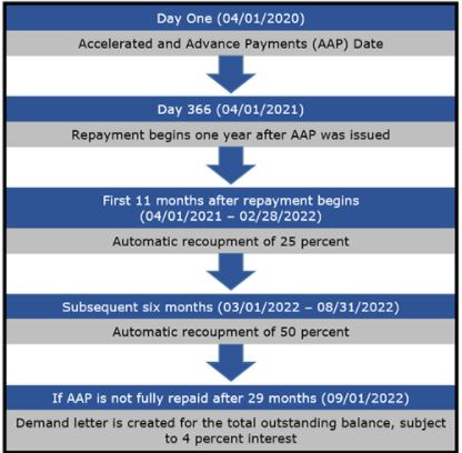 2. Recoupment Will Occur Automatically by Reduced Medicare Payment for 17 Months. No further action will be necessary for recoupment to begin, as the MAC will automatically offset Medicare payments. Once recoupment begins, until the amount received under the AAP program is repaid in full, Medicare providers and suppliers will receive reduced Medicare fee-for-service payments. The recoupment rate for the first 11 months is a 25 percent reduction to Medicare payments, increasing to 50 percent for the subsequent six months. After the 17-month recoupment period ends, if the provider or supplier has not fully repaid the AAP funding it received, the MAC will issue a demand letter for full repayment of any remaining balance. The issuance of the demand letter triggers an interest rate of 4 percent added to the remaining balance until paid in full, an amount Congress reduced from typical repayment approaches in excess of 10 percent. Interest will be assessed at the end of each 30-day period until the amount is fully repaid, with payments made by the provider or supplier (either by automatic recoupments or a separate payment) repaying interest first, followed by any other outstanding overpayments and finally the AAP balance, until paid in full. The included infographic helps illustrate the amended repayment terms for a provider or supplier that was issued an AAP on April 1, 2020, based on a similar graphic provided by First Coast.