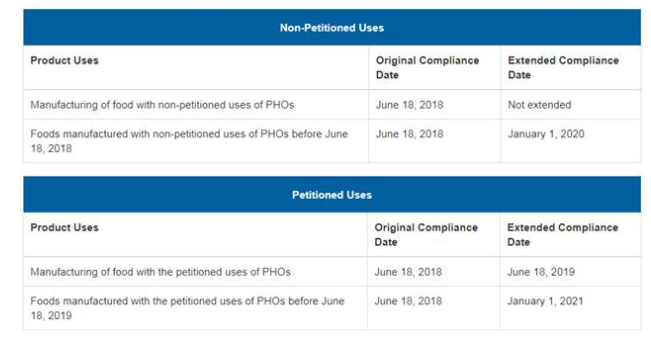 The FDA has stated that the extension is due largely to the 3-24 month shelf life of products containing PHOs such that these products will be in distribution for some time after the compliance date, as well as due to additional compliance requirements placed upon the food industry because of the FDA’s denial of a concurrent food additive petition by the Grocery Manufacturers Association.