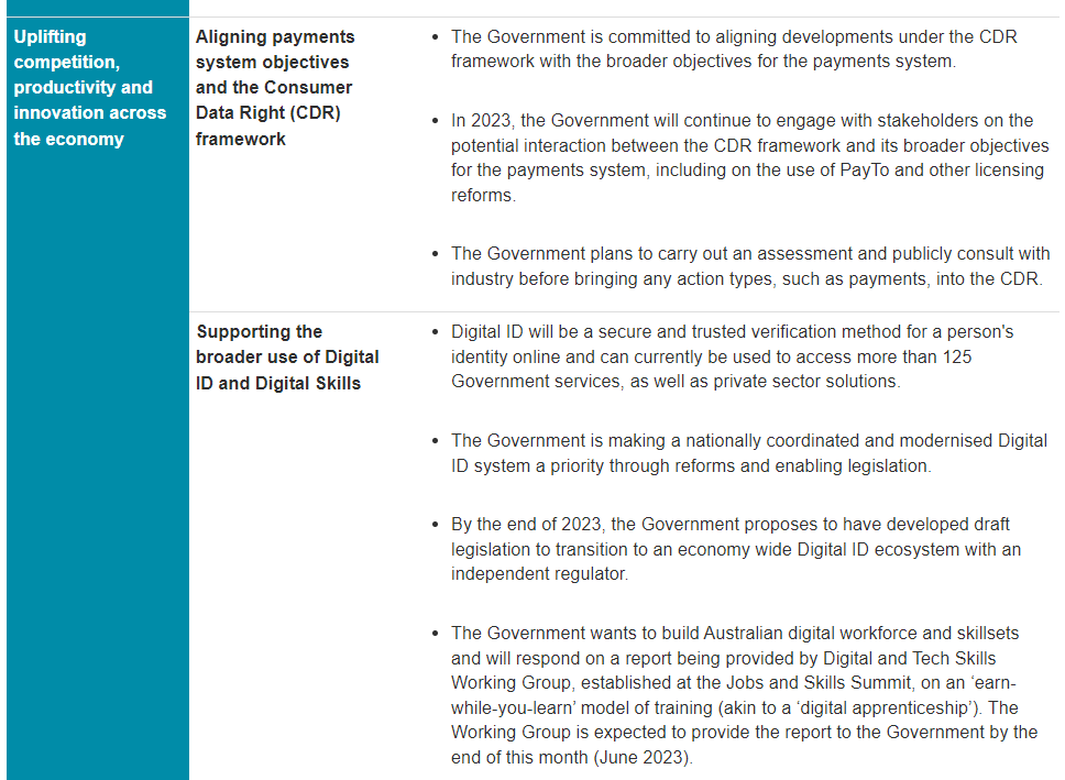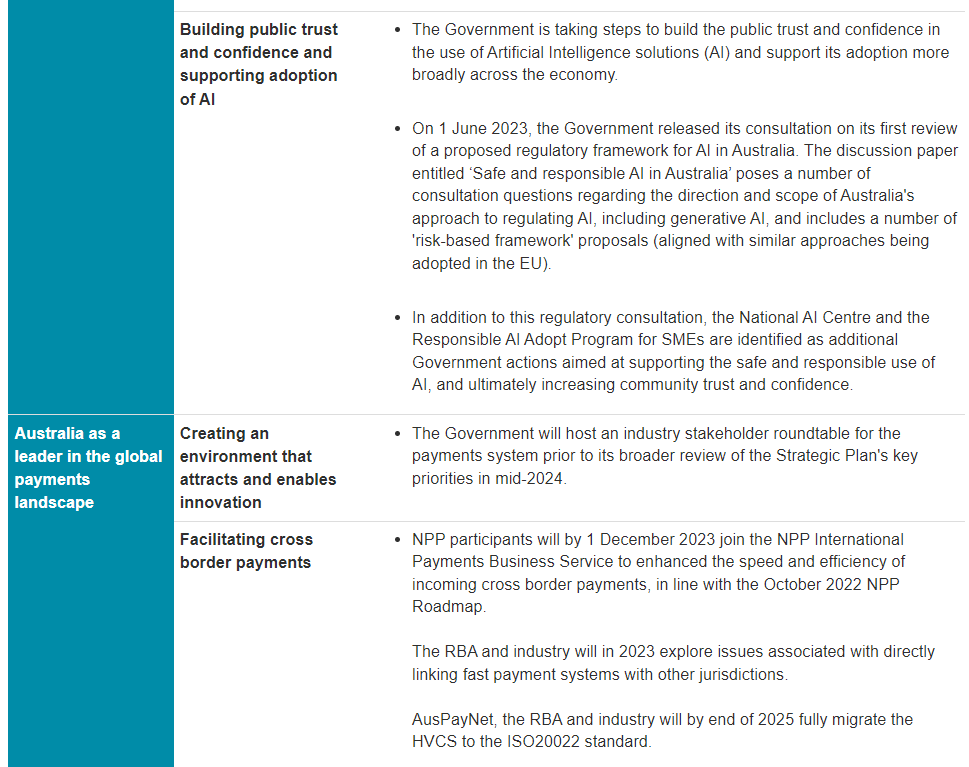 Those operating in the payments services sector will note that the Strategic Plan does not contain any materially new proposals. It is largely a repackaging of the announcements in Treasury’s previous Consultation Papers, most recently in December 2022. There is a little more colour provided nonetheless, in particular as regards the commitment to align and increase communication both between regulators and across ongoing legislative reforms impacting in adjacent areas, such as the CDR and on AI. Clarity on the timeline for the implementation of the revised payment systems licensing framework is also helpful for business.