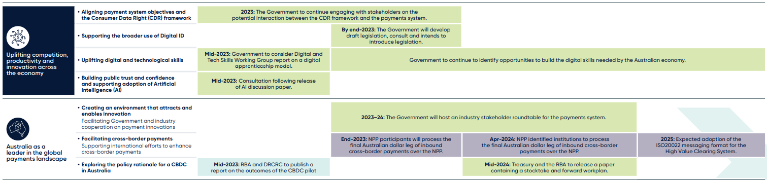 Further consultation on the regulatory obligations under the new licensing framework will take place later in 2023 with the introduction of legislation for the new payments licensing regime in 2024. Following the passage of legislation, detailed elements of the payments licensing reforms will be subject to further consultation. They include the design of supporting regulations for the ePayments Code, common access requirements, and mandatory industry standards.