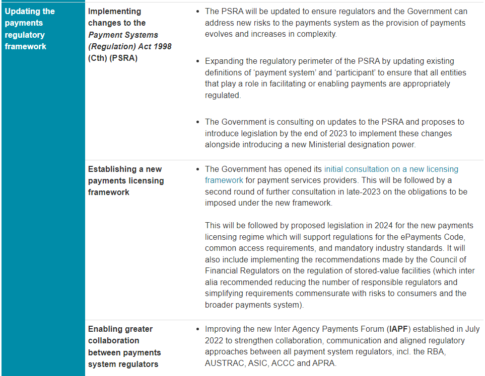 - a new payments licensing framework under the Payment Systems (Regulation) Act 1998 (Cth);