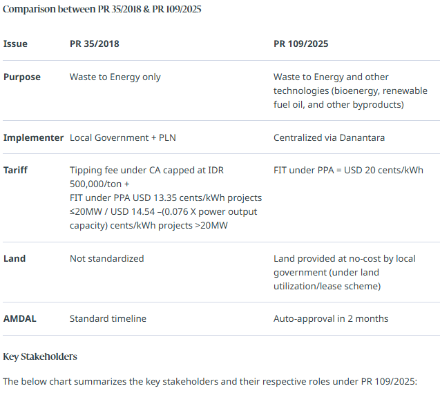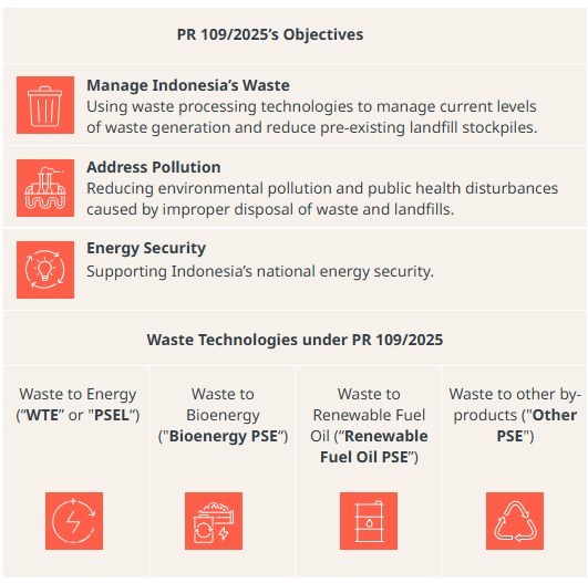 PR 109/2025 now explicitly revokes and replaces PR 35/2018 to reflect a renewed political commitment to support and accelerate the development of waste management projects which convert urban/municipal waste into renewable energy through environmentally friendly technologies (referred to as Pengolahan Sampah menjadi Energi Terbarukan Berbasis Teknologi Ramah Lingkungan or "PSE").