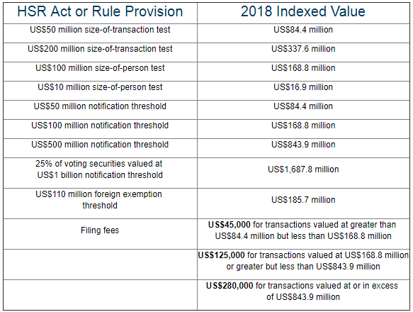 The U.S. Federal Trade Commission (“FTC”) announced on January 26, 2018, that the dollar-based thresholds applicable to the Hart-Scott-Rodino (“HSR”) premerger notification program will be raised about 4.4 percent from the 2017 levels. As a result, the HSR minimum size of transaction threshold will be raised to US$84.4 million from US$80.8 million. Transactions valued above the old threshold of US$80.8 million but below the new US$84.4 million threshold will no longer require an HSR filing. The dollar thresholds that determine the applicable filing fee will also be revised accordingly.