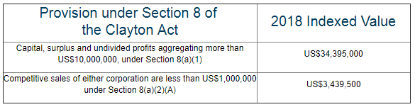 Section 8 of the Clayton Act generally prohibits a person from serving simultaneously as a director or officer of two sizable competing corporations engaged in commerce, unless their “competitive sales” — the gross revenues for all products and services sold by one corporation in competition with the other — are minimal. As with the HSR Act, the dollar thresholds defining “sizable” and “minimal” are indexed to changes in the gross national product. As a result of the most recent indexing, the Section 8 prohibition on interlocking directorates now applies only if each competing corporation has capital, surplus, and undivided profits aggregating more than US$34.395 million. The interlocking directorate prohibition does not apply, however, if either corporation’s “competitive sales” are less than US$3.4395 million. Other “safe harbors” exist that are based on calculating the competitive sales as a percentage of the corporation's total sales.
