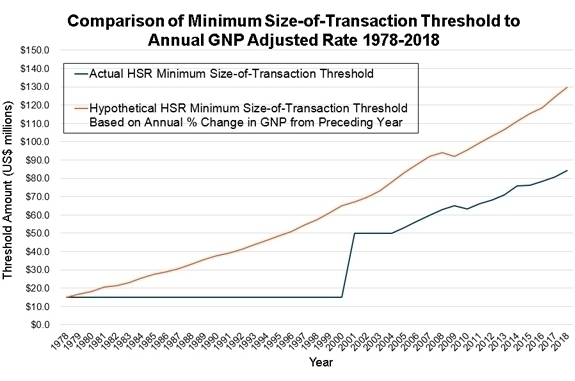 The HSR premerger notification program applies to large transactions involving large parties engaged in commerce. Dollar thresholds defining “large” were increased in 2000 from US$15 million to US$50 million and, since 2005, have been indexed to reflect changes in the gross national product (GNP). The following graph illustrates the changes in the HSR minimum size-of-transaction thresholds, as compared to changes in the GNP since 1978, when regulations implementing the HSR Act first went into effect. If the US$15 million minimum size-of-transaction threshold in 1978 had been indexed to changes in the GNP, it would be at approximately US$129.5 million rather than US$84.4 million.