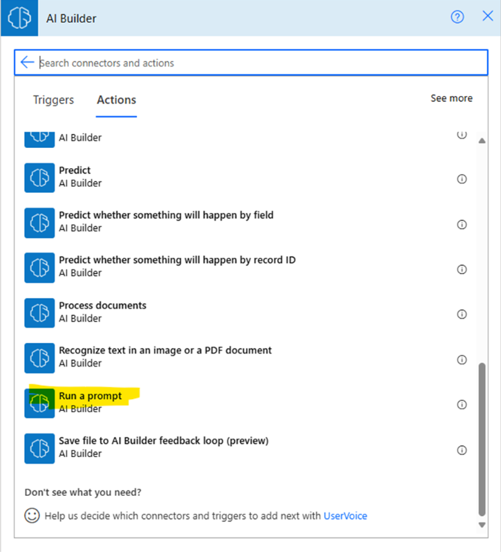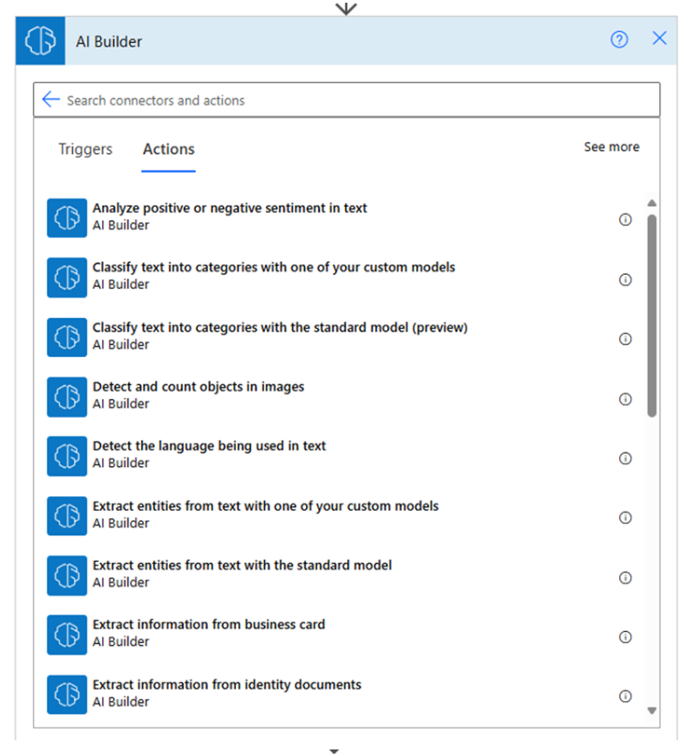 With Power Automate there are a lot of options, as you can see below. Some are pre-built, but you can also choose to run your own prompt.