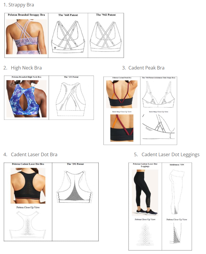 On 29 November, some 5 days later, lululemon brought its own action against Peloton, along the lines set out in its cease-and-desist letter. lululemon alleged that the following five Peloton Apparel products infringed its patents (details of which are included next to the images of the Peloton products):