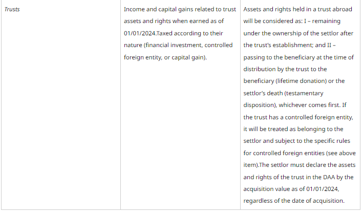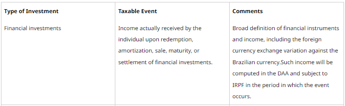 Note: this form of taxation does not apply to operations subject to capital gain on the sale, discharge, or settlement of assets and rights located abroad that do not constitute financial investments under the MP.