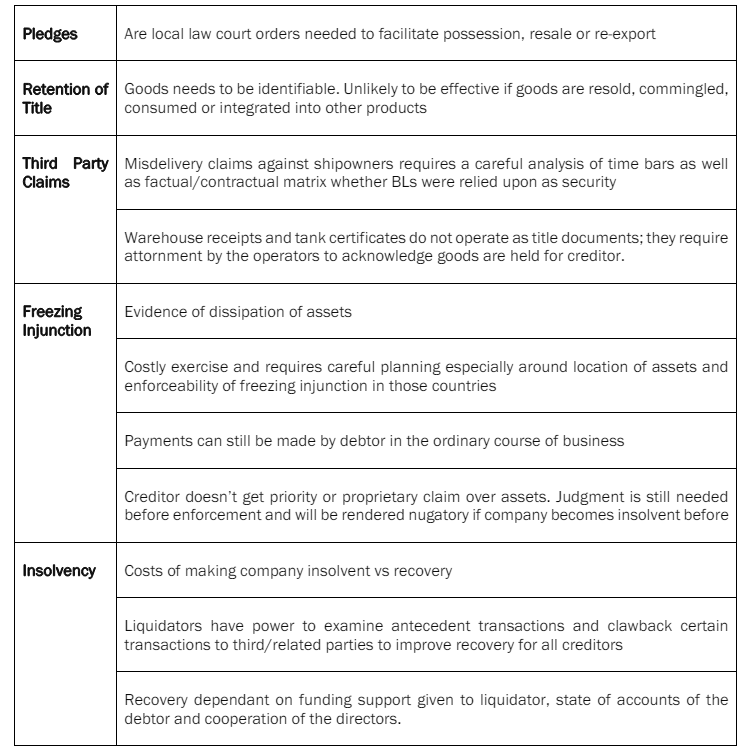 Enforcement of pledges also requires understanding local law requirements, which may not necessarily recognise pledges based on possession or may otherwise involve a lengthy administrative process under local laws to facilitate a sale. The timing and costs involved are key factors in such recovery exercises.