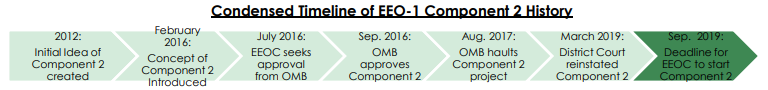 The EEOC expects to begin collecting EEO-1 Component 2 data for calendar years 2017 and 2018 in mid-July, 2019, and will notify filers of the precise date the survey will open as soon as it is available. On May 3, 2019, the Department of Justice filed a Notice of Appeal in National Women's Law Center. The filing of this Notice of Appeal does not stay the district court orders or alter EEO-1 filers' obligations to submit Component 2 data. EEO-1 filers should begin preparing to submit Component 2 data as described above. https://www.eeoc.gov/.