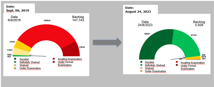 The Patent Backlog Combat Plan, launched in 2019 by the BPTO to settle approximately 150,000 patent applications pending examination, was certainly one of the most successful projects in the Office over the last five years. The BPTO achieved a remarkable 96% examination rate by August 2023, as depicted in the charts below: