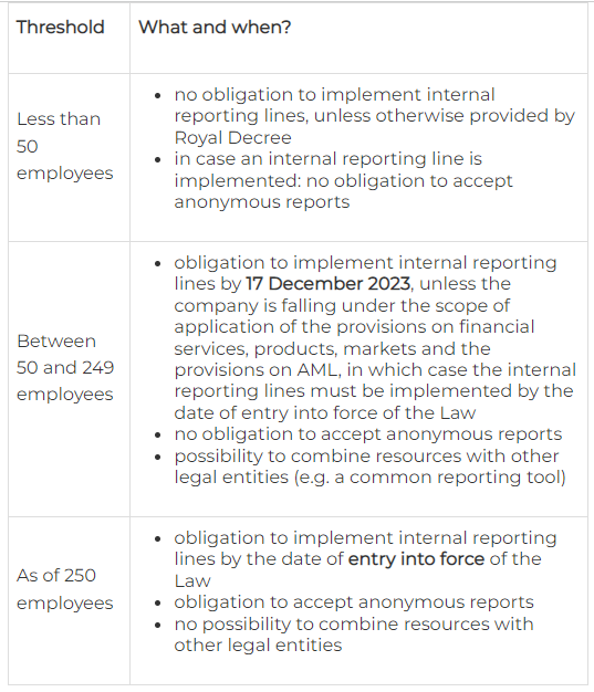 Legal entities in the private sector with more than 50 employees must set up procedures for internal reporting and follow-up, after consultation with their employee representative bodies, if any.