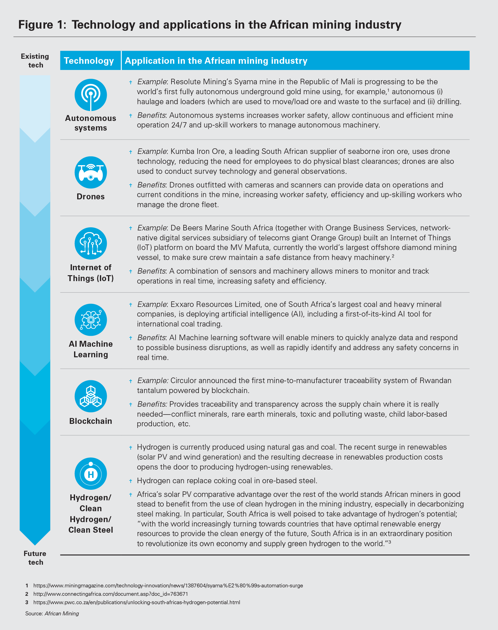 African mining companies are rapidly adopting the latest technologies to modernize their operations, yet significant opportunities remain. Figure 1 shows some examples of existing and future mining technologies and their application in the African mining industry.