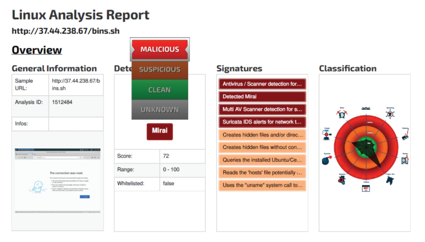 The Mirai botnet is a well-known malware strain that targets IoT devices, infecting them to execute DDoS attacks. The script downloaded from http://37[.]44[.]238[.]67/bins[.]sh is associated with the GAFGYT botnet. These scripts are designed to create hidden files, manipulate system configurations, and evade detection, aligning with typical botnet behaviour.