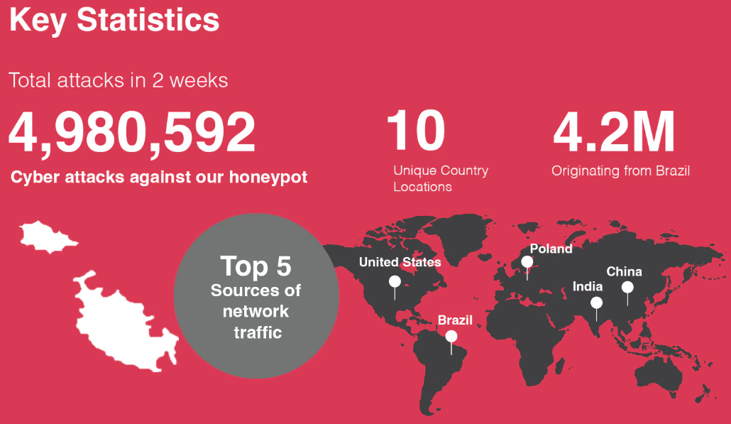 In the ever-evolving landscape of cyber security, understanding and mitigating threats is paramount. This article delves into the insights gathered from T-Pot honeypot, a sophisticated openly sourced honeypot framework, between August and October. The honeypot is designed to attract and analyse cyber threats. Our PwC Cyber Security & Privacy team deployed an in-house instance of T-Pot honeypot based in our Maltese offices. T-Pot honeypot consists of multiple decoy systems that mimic real computer environments, luring attackers into a controlled and monitored setup. By capturing and studying the actions of these attackers, T-Pot honeypot provides invaluable data that helps us understand cyber threats specifically targeting and affecting the Maltese islands. During our observations, we noticed well over 6 million attacks, of which, over 5 million were Distributed Denial of Service (DDoS) packets.