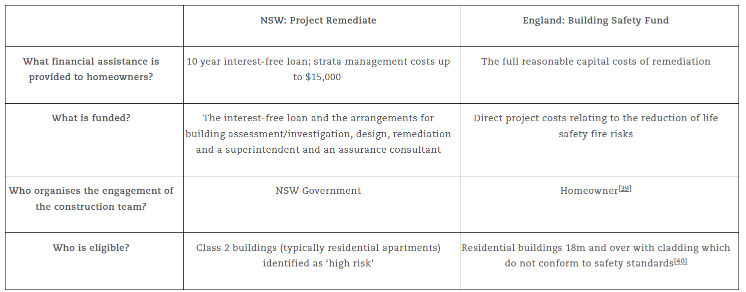 One reason for this approach, compared to NSW, is that the affected buildings in England are often owned and/or managed by registered social housing providers, management companies, tenants’ associations and other entities who do not necessarily have sufficient funds to rectify the issues discovered in their buildings.