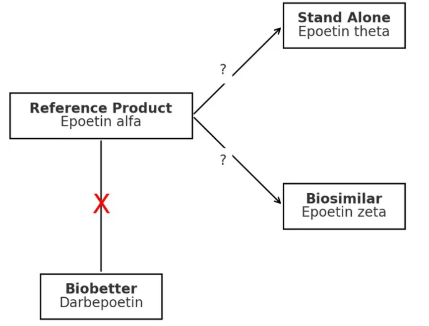 Defining the scope of an SPC for biological substances is challenging due to their inherent variability. The MPI study used different epoetin glycoforms and sequence variants to illustrate this issue: alfa (reference), theta (stand-alone, no biosimilarity established), zeta (biosimilar), and darbepoetin (a biobetter with a different amino acid sequence and improved properties).